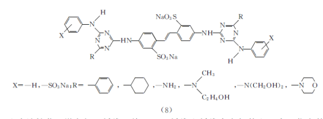 1943年Ciba公司对DSD酸三嗪类增白剂进行了深入的研究,由于其相对简便的合成及其产品良好的使用性能,推出了许多新型的荧光增白剂(8)。